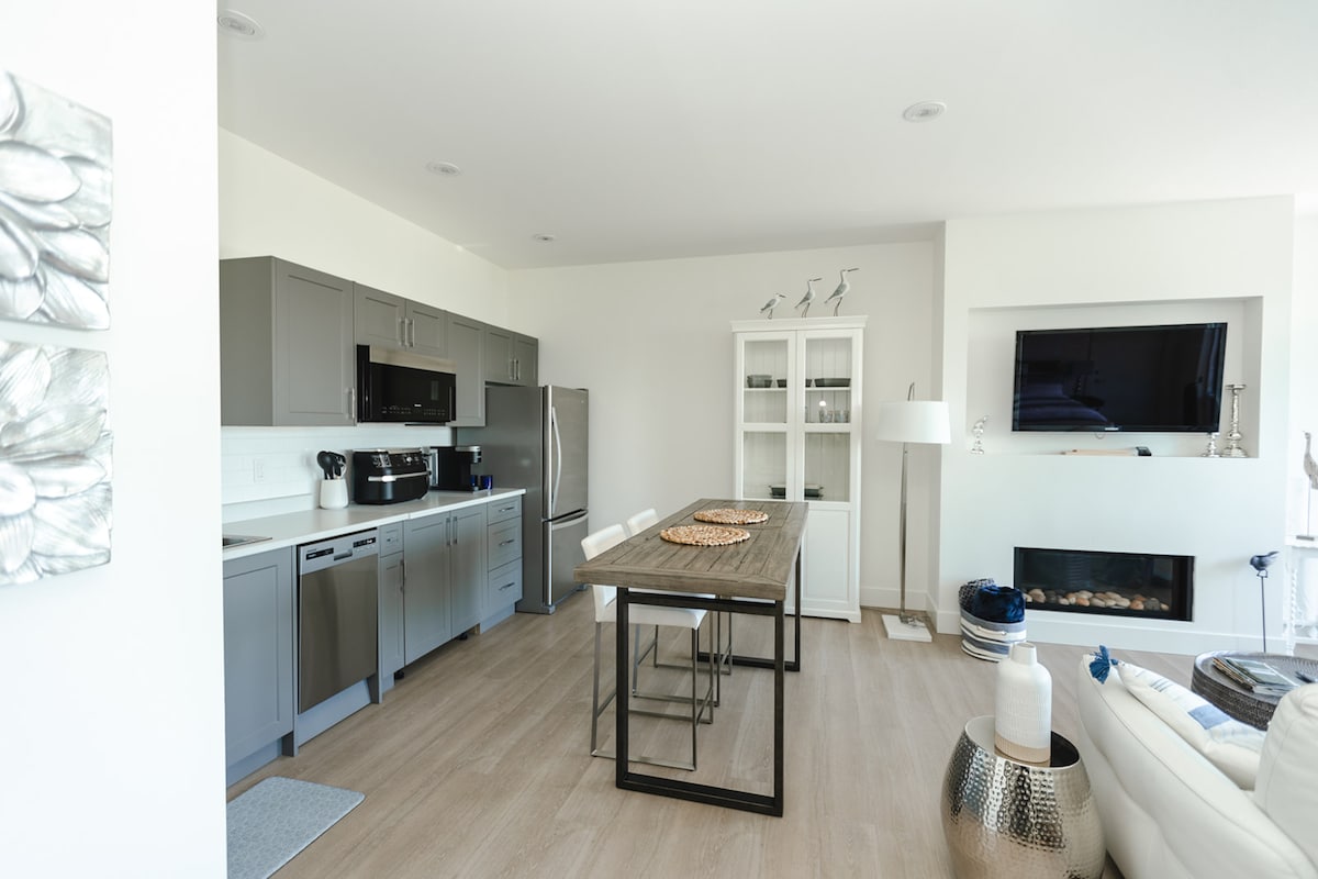 Phòng của chúng tôi là một nơi nghỉ dưỡng một phòng ngủ tuyệt đẹp, mới được xây dựng, có trần 9’và không gian 810 SF hào phóng. Nó có TV thông minh 58"và bếp được trang bị đầy đủ tiện nghi, đảm bảo lối sống chất lượng cao trong chuyến đi của bạn. Tận hưởng bình minh và hoàng hôn ngoạn mục từ ban công riêng của bạn, với tầm nhìn tuyệt vời ra đại dương và núi non qua eo biển Georgia. Tọa lạc tại vị trí thuận tiện, căn hộ của chúng tôi là một cơ sở lý tưởng để khám phá sức hấp dẫn của Đảo Vancouver.