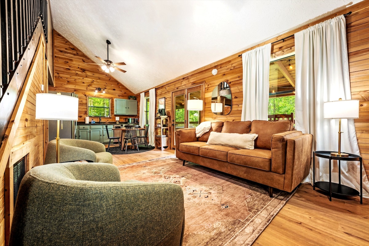 Chào mừng bạn đến với Eagles’s Rest – một cabin gỗ hai phòng ngủ, hai phòng tắm quyến rũ nép mình trên sườn núi, cho tầm nhìn tuyệt đẹp ra những ngọn núi và thung lũng bên dưới. Thư giãn trên boong riêng hoặc ngâm mình trong bồn tắm nước nóng trong khi tận hưởng khung cảnh ngoạn mục và hoàng hôn rực rỡ. Bên trong, một bức tường cửa sổ cho phép bạn trải nghiệm những khung cảnh tuyệt vời tương tự từ mỗi phòng. Cả hai phòng ngủ đều có giường cỡ king và phòng tắm khép kín để mang lại sự thoải mái tối đa.