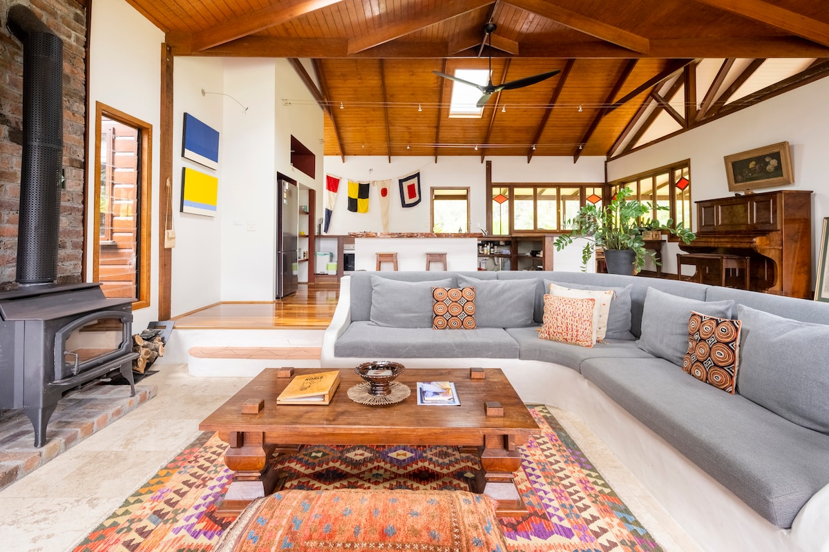 Biệt thự siêu hiện đại, rộng rãi, xinh đẹp nằm trong khu vườn bách thảo cận nhiệt đới kỳ lạ rộng 5 mẫu Anh với các khu rừng nhiệt đới và nhánh sông tự nhiên, nơi bạn có thể quên đi mọi thứ và tận hưởng cuộc sống. Một không gian riêng tuyệt đẹp, có hàng rào đầy đủ cho tối đa 4 người để thư giãn và tận hưởng sự yên bình của Vườn nước Bali xung quanh và hồ bơi riêng của bạn và bồn tắm nước nóng 5 người trong một vọng lâu tuyệt đẹp. Không gian hoàn toàn yên bình, nhưng chỉ mất 15 phút để đến Mullumbimby, Brunswick Heads và các bãi biển ven biển.