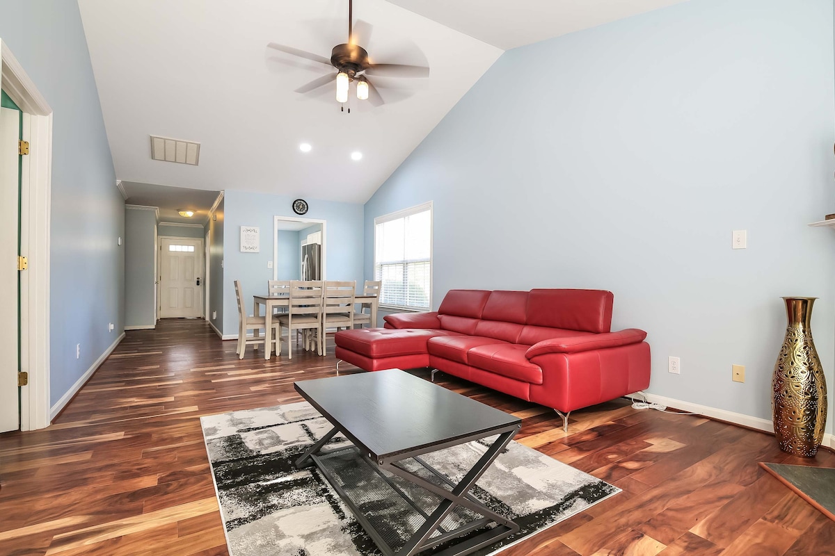 Nestled in a serene, semi-gated community, Pearlitah is a newly-renovated 3-BR townhouse in Greensboro that blends luxury with comfort. The master suite features a California King bed, and the home comfortably sleeps up to 9. Just 14 minutes from GSO airport, with easy highway access, and walking distance to local eateries and shops, Pearlitah offers a tranquil yet connected retreat. Ideal for relaxation and exploration, it’s the perfect home-away-from-home in this charming residence.