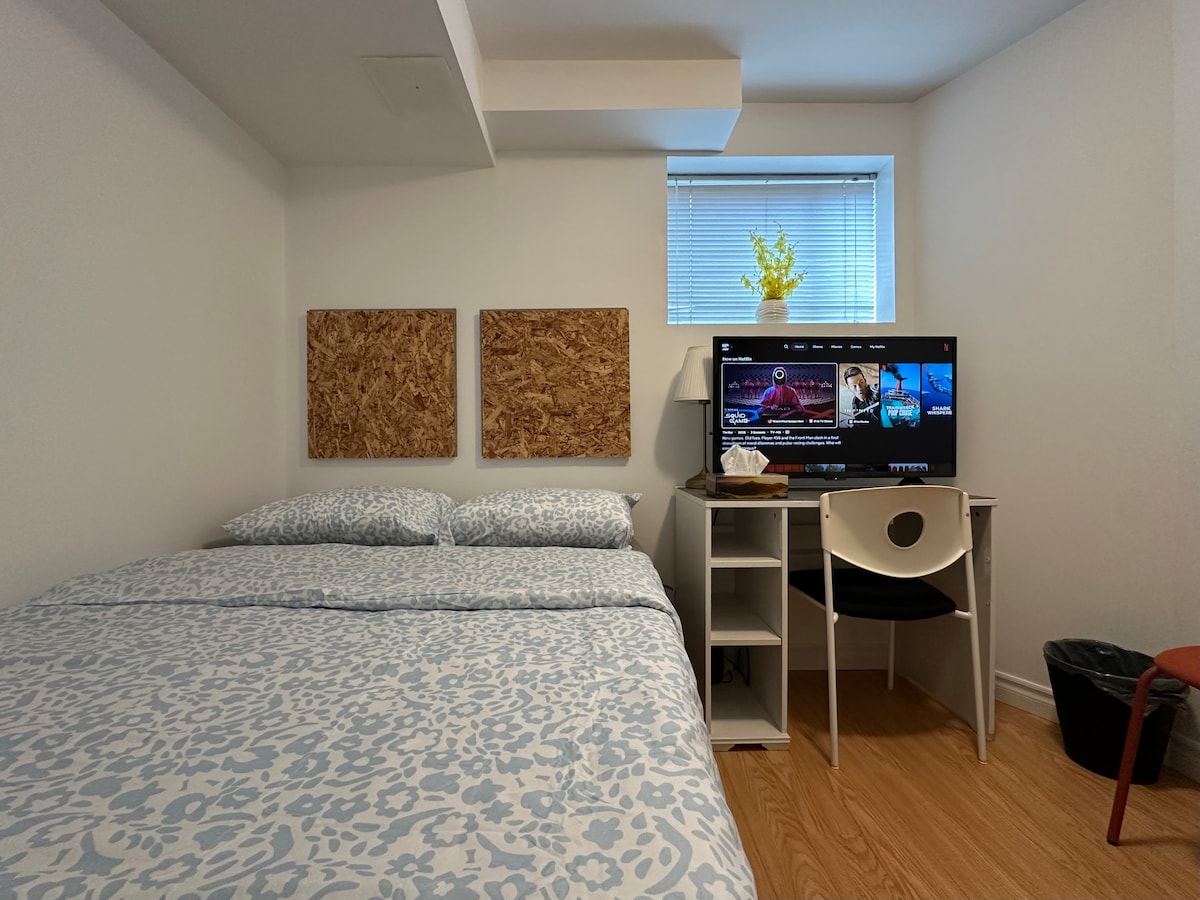 Cozy, bright, furnished basement studio with high ceilings and private entrance—ideal for short-term visitors at Bathurst Manor area. This place includes a small kitchen, in-suite washer/dryer, full bath, TV, and Bell 5G internet. Netflix and Prime streaming available. Great location: 10 min to Hwy 401, groceries, restaurants, and easy access to Downtown, Pearson Airport, and Toronto Convention Centre and a short ride to Rogers Stadium . Quiet, smoke-free, pet-free home. Sheppard & Bathurst