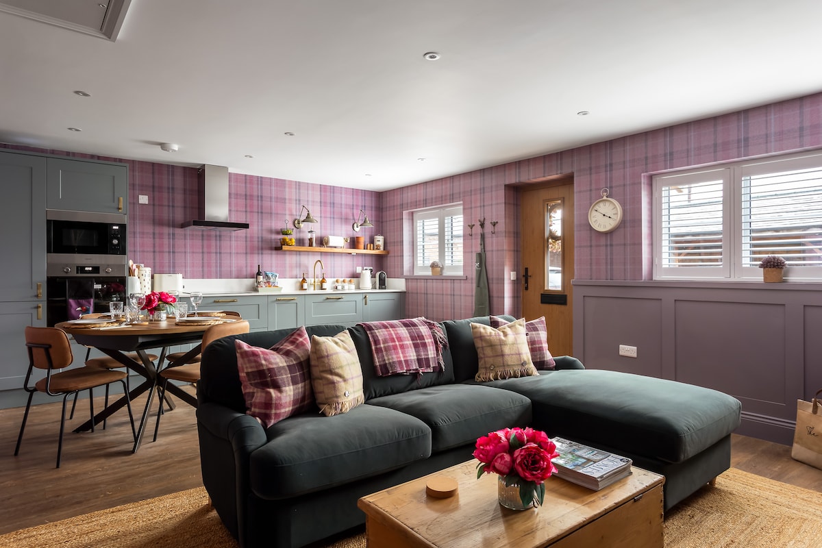 "The One With The Slide" a luxurious open plan barn conversion with enormous hot tub, games table, 65 inch TV and yes - a slide down from the luxury mezzanine bed chamber. Ideal for couples alone or with kids. A fully equip kitchen, large bathroom with 2 person shower, fantastic countryside views and an outdoor space, light the fire pit (wood not provided) for added ambiance and stargaze the autumn Skys from our hilltop location. 1 bedroom with a king size double plus 1 double sofa bed.