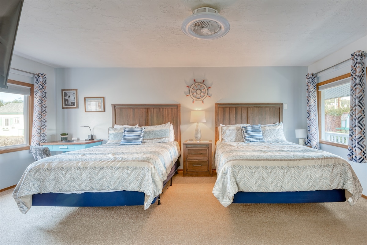 Experience the quiet beauty of Depoe Bay at this suite at Trollers Lodge! The Beacon is a studio unit with a kitchenette (no cooktop/oven) that has a microwave, mini refrigerator, Coffee maker and a toaster. The unit also has a flat screen TV with cable, and a small desk area for those that may need to bring along work. This unit can sleep 4 with two queen beds. There are several picnic tables and benches throughout the property available for outdoor dining and nice relaxing rest in the co