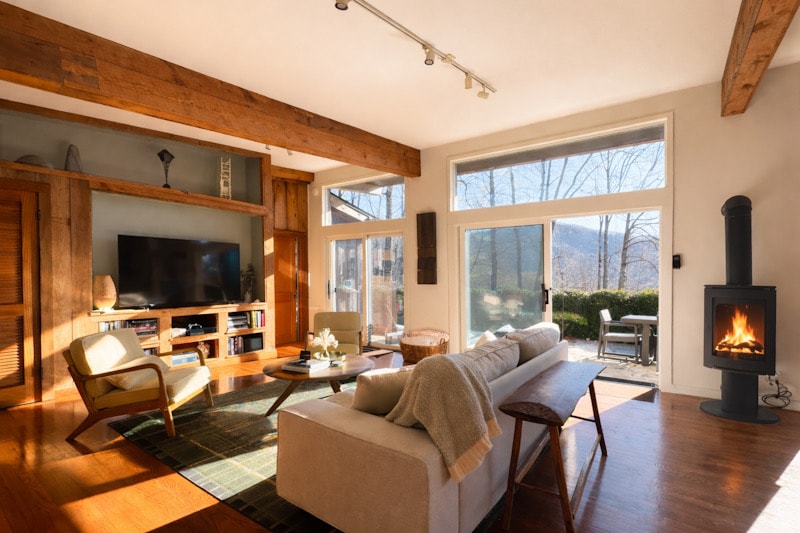 Discover Almost Heaven, a newly listed 2-bedroom retreat with hot tub nestled in the mountains just outside Burnsville, NC. This stunning home, overlooking the South Toe River and Mount Mitchell Golf Course, offers an elegant yet cozy setting with soaring ceilings, walls of windows, and an extraordinary collection of history books and classic novels. Have long chats next to the fire, play games with friends, sit around the fire table on the deck and relax to the sound of the river below.