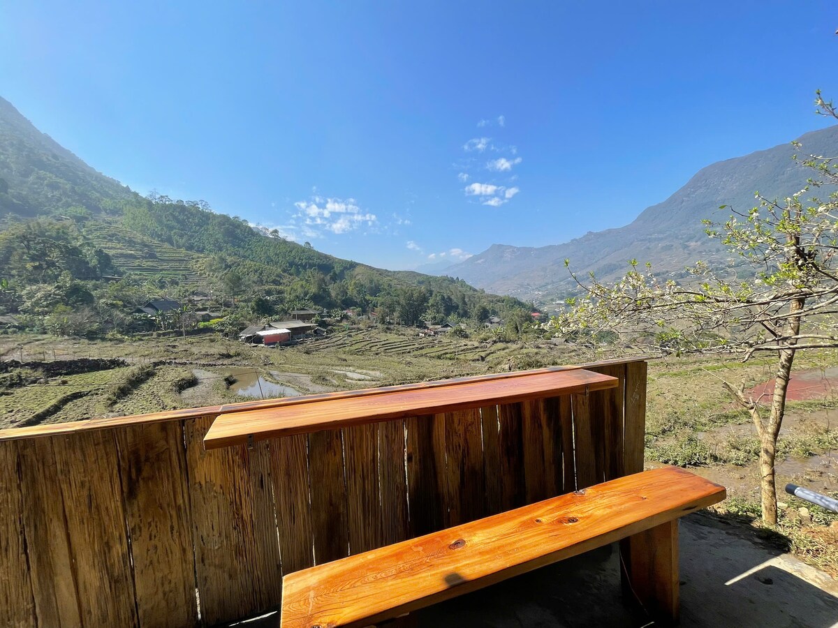 Bungalow có view nhìn sang ruộng bậc thang và bản làng, bungalow có 2 giường, có đồi thông, có nhà vệ sinh riêng, thuận tiện đi tham quan các điểm du lịch M ù Cang Chải