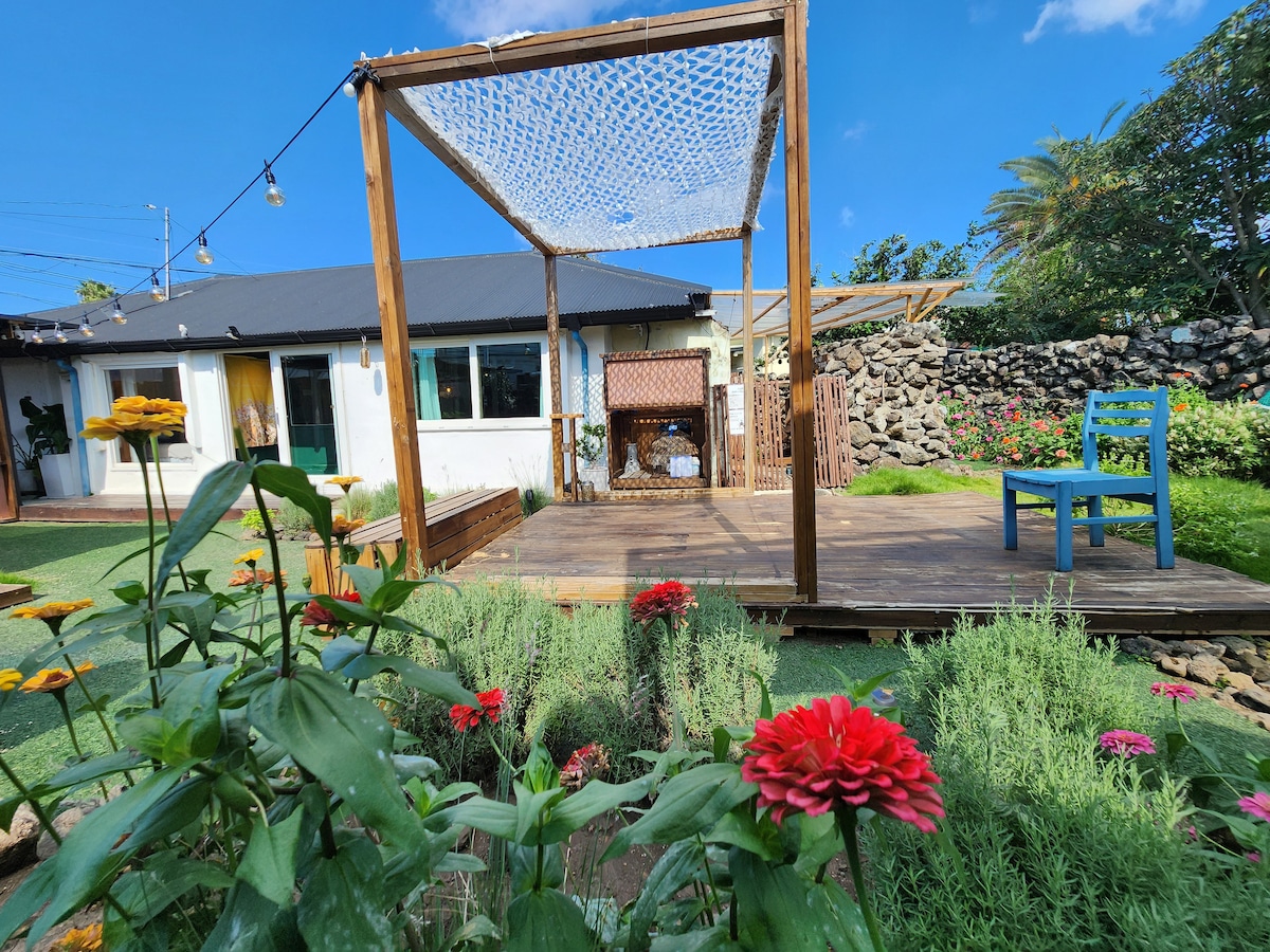 Nằm ở làng ven biển Hamdeok, Jeju Đây là Hoyudong Stay, một ngôi nhà riêng có tường đá. Nghỉ ngơi khỏi cuộc sống bận rộn Để bạn có thể thư giãn hoàn toàn trong ngôi làng Jeju yên tĩnh Không gian này được chuẩn bị với sự thoải mái và ấm áp. Bãi biển Hamdeok, bạn có thể đến trong khoảng 10 phút đi bộ Bầu không khí làng quê yên tĩnh hòa quyện vào Bạn sẽ hài lòng với cả du lịch và thư giãn. Khi bạn vào chỗ ở Phòng khách đầy nắng và phòng ngủ ấm cúng, Một căn bếp gọn gàng và khu vực phòng khách thoải mái được kết nối. Trong không gian ngoài trời được bao quanh bởi những bức tường đá Có một sân cỏ rộng rãi và một bể sục ngoài trời riêng. Bạn có thể thoải mái xả mệt mỏi trong chuyến đi của mình với nước ấm. Vào buổi tối, với một ngọn lửa Cảm nhận đêm yên tĩnh của Jeju từ từ. Chuyến đi gia đình, chuyến đi với trẻ em, tụ tập với bạn bè và thậm chí cả chuyến đi gia đình lớn để bạn có thể ở thoải mái với bất kỳ người bạn đồng hành nào Chúng tôi đã chuẩn bị cẩn thận không gian và tiện nghi. Trong một không gian nơi sự nhạy cảm và thoải mái của Jeju cùng tồn tại Cho cơ thể và tâm trí của bạn nghỉ ngơi Tận hưởng một chuyến đi đặc biệt đến Jeju.