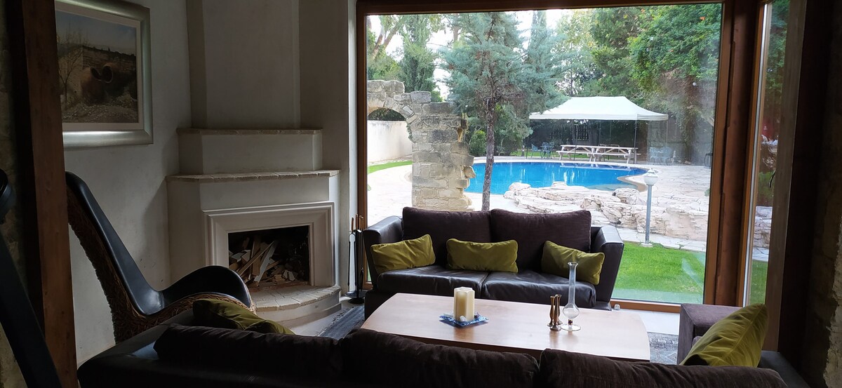 Villa Eleni is located in Pano Pachna village that is a center of many points of interest .From there you can reach by car easily and less than 30 min Limassol 33km, Paphos 50 km, Petra tou Romiou 27 km, Omodos 11 km , Platres 20 km, Avdimou Beach 23 km, and Troodos mountain 28km.Villa Eleni is a traditional village house of 180 m2 with 4 bedrooms (2 double beds, 4 single beds), 2 bathrooms, open plan kitchen, fire place,big living room with a dining table and it can host 8 persons.