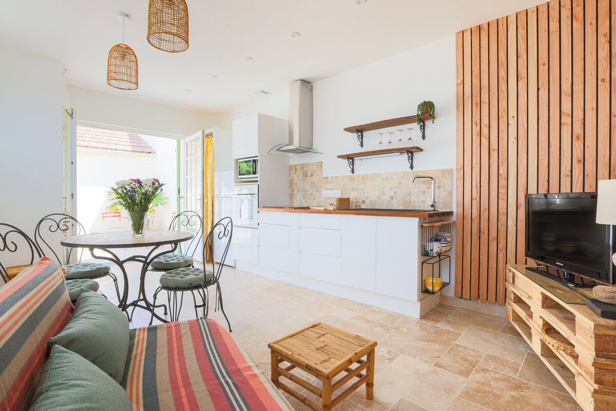 Căn gác trong căn hộ 2 tầng rộng 30m2 này (cách bãi biển 5 phút đi bộ), được thiết kế và suy nghĩ cho một kỳ nghỉ chăm sóc sức khỏe cho 2 người. Một bể sục jacuzzi riêng thực sự, một phòng mát-xa, giường cỡ Queen với tầm nhìn ra các vì sao và một khu vườn riêng rộng 25m². Khu phố rất yên tĩnh. Rất ấm cúng, căn hộ hai tầng này được trang bị rất tốt: nhà bếp được trang bị, cốc sâm banh, mọi thứ cho bữa tối và bữa sáng, lò vi sóng, nespresso, ghế sofa, TV kết nối, đèn LED, wifi, loa trợ lý giọng nói, spotify, nhà vệ sinh riêng, vòi sen, máy sấy phục vụ, máy lẻ thân mật.