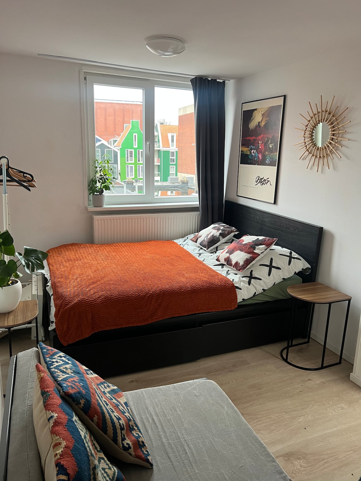 Bright, stylish, and perfectly located — this comfy room sits right in the heart of Zaandam, only an 11-minute train ride from Amsterdam Central Station. The space has a modern yet warm feel, with a large window overlooking the iconic green Zaandam houses. There’s a comfortable double bed, a small sofa, side table, clothes rack, and a few plants that make the room feel calm and welcoming. We living with 2 girls on the same floor. The apartament is quiet and clean. (See the stairs please!)