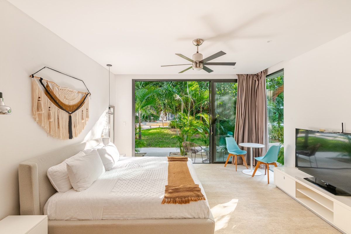 True luxury studio apartment with nature views and spacious patio on the 2nd floor at Panoramic Tulum. Enjoy the incredible 360º infinity rooftop pool and vivid neighborhood of La Veleta, only 15 minutes from the amazing Tulum beaches while close to town. You will have strong A/C, fast Wifi (32 Mbps fiber), blackout curtains, large smart TV, fully equipped kitchen, gym access, and access to the beautifully designed rooftop and 360º pool.