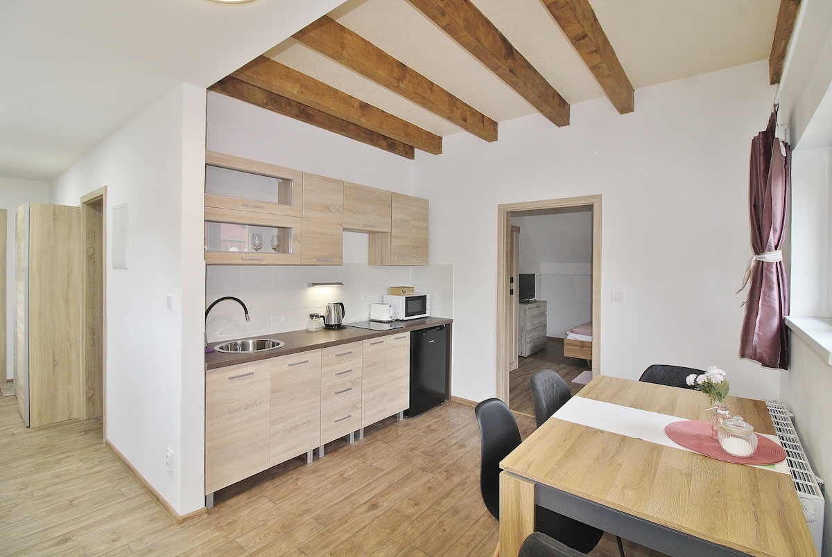 Căn hộ phong cách, được cải tạo tinh tế trong một ngôi nhà lịch sử. Phòng ngủ với giường đôi và hai giường đơn, bếp đầy đủ tiện nghi với ghế sofa giường và lò sưởi. Phòng tắm mới xây dựng với vòi sen. Căn hộ rộng rãi, phù hợp cho gia đình bốn đến năm người. Ngôi nhà có nền móng từ thế kỷ 15 và không khí độc đáo. Có chỗ đậu xe trong sân. Ngôi nhà cách quảng trường Kašperské Hory 200 m. Gần đó có một số nhà hàng và cửa hàng tạp hóa.