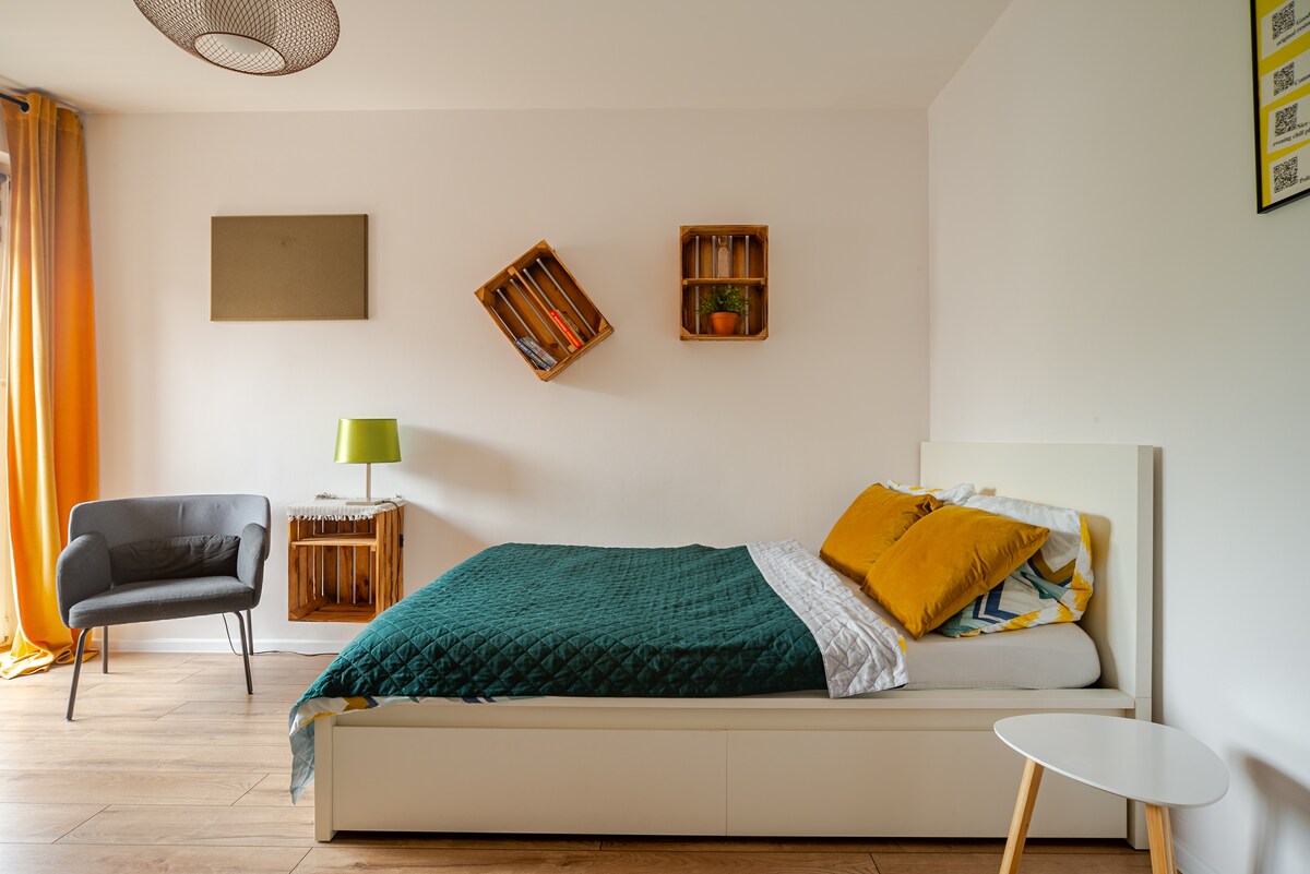Căn hộ studio được trang trí theo phong cách loft dành cho 2 người. Căn hộ bao gồm một nhà bếp đầy đủ tiện nghi, phòng ngủ và phòng tắm. Xung quanh yên tĩnh và thanh bình, các cửa sổ hướng ra sân với tầm nhìn ra cây xanh. Nội thất sáng sủa và rộng rãi. Trong phòng ngủ có một chiếc giường đôi 140 x 200cm, một chiếc bàn nhỏ, một chiếc ghế dài và một chiếc bàn cao với hai chiếc ghế bar, nơi bạn không chỉ có thể ăn mà còn có thể làm việc. Phòng tắm có buồng tắm vòi sen lớn.
