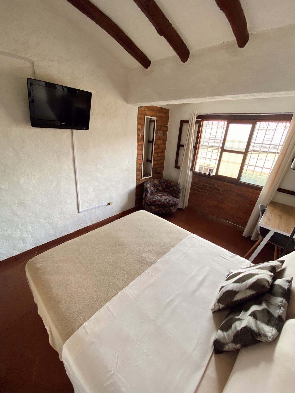 Habitación doble con 2 televisores para 4 personas con baño interno privado. Ideal para familia. Cerca al Teleférico, plaza Bolivar, catedral, etc. Acceso a cocina para preparación rápida de alimentos.
